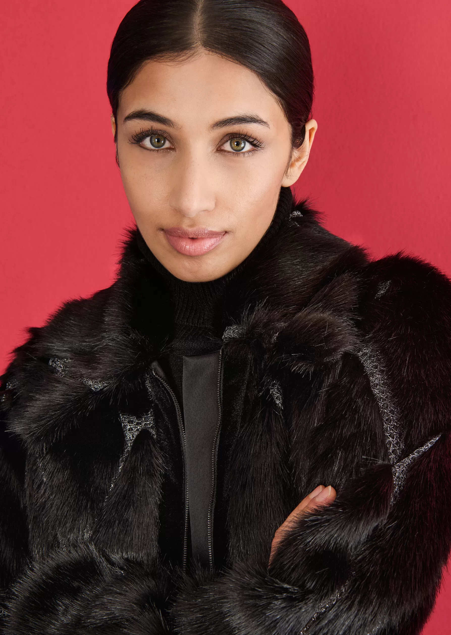 Animal welfare meets glamor. Naturally, we made this cool but also elegant, short jacket from a beautiful faux fur so that no animals had to suffer. Not only will it keep you warm, but it also looks stunning, whether you wear this Jacket with its wide collar, its velvet waist band and sporty, blousy width as a style contrast with denim or over an elegant cocktail or evening gown as the sun sets.