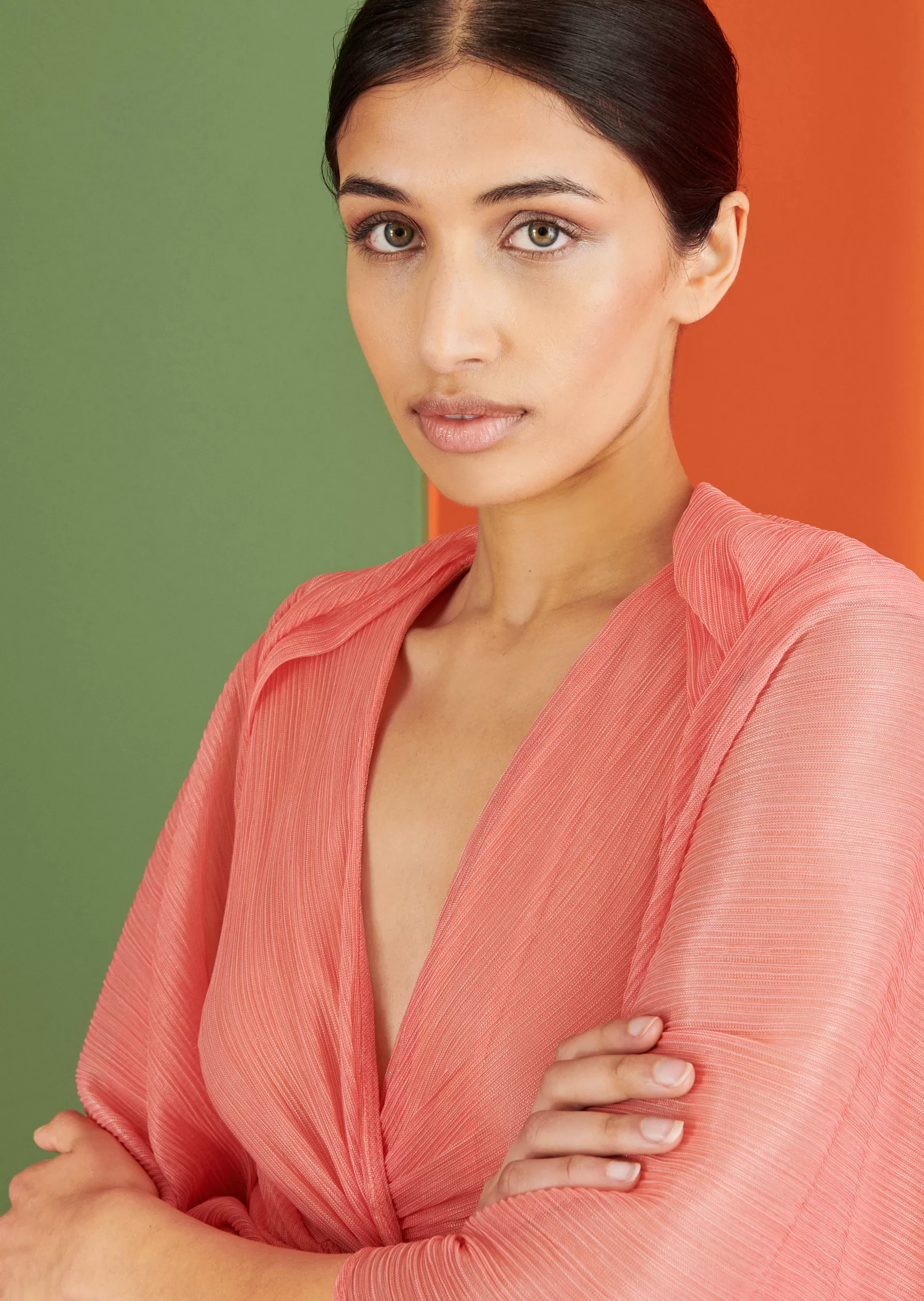 Quite twisted – and we mean that literally. Our new jumpsuit twists in an almost racy pirouette at the top. This produces a sophisticated knot detail that accentuates the feminine V-neckline. Additionally, targeted draping gives the illusion of a wasp waist. The leg is wide but not too loose, so you can move freely and enjoy the dance floor. This is when the asymmetric cape unfurls its full effect. Wear this glamorous, shimmering voile piece with simple, understated accessories. It will still make you shine.