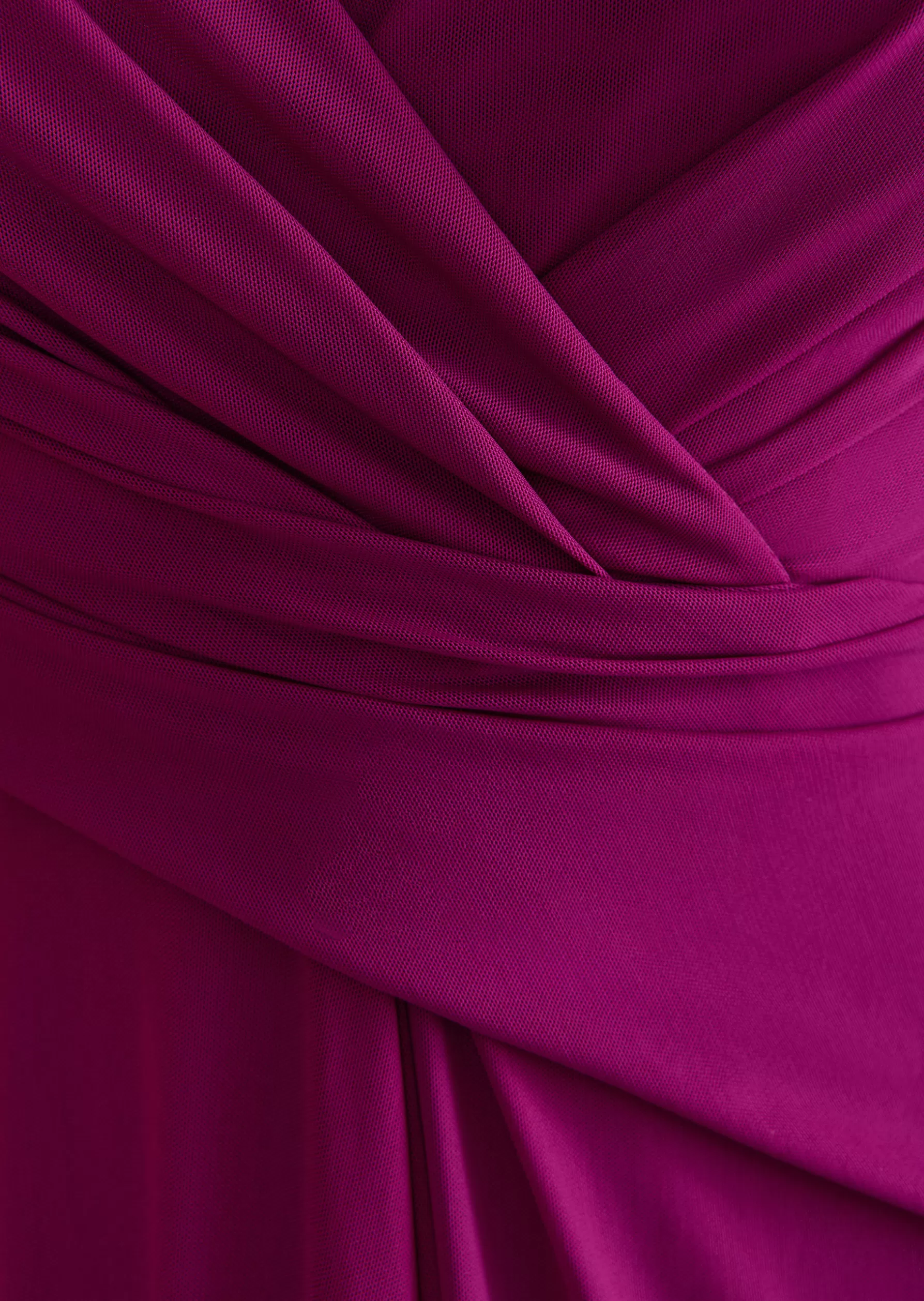 May we have this dance? It’s not by chance that this wide, swirling midi cocktail dress is one of our most popular evening styles right now. After all, the dress gives you a great cleavage, a flat stomach, and a slim waist – while little lumps, bumps, and other problem areas, disappear beneath draped folds. Thanks to the fabric, a flowy stretch tulle, you’ll look refined and elegant. You can also show off your favorite stilettos to best advantage if you wear this look to a wedding, whether you’re a bridesmaid, the mother of the bride, or simply a well turned out wedding guest.