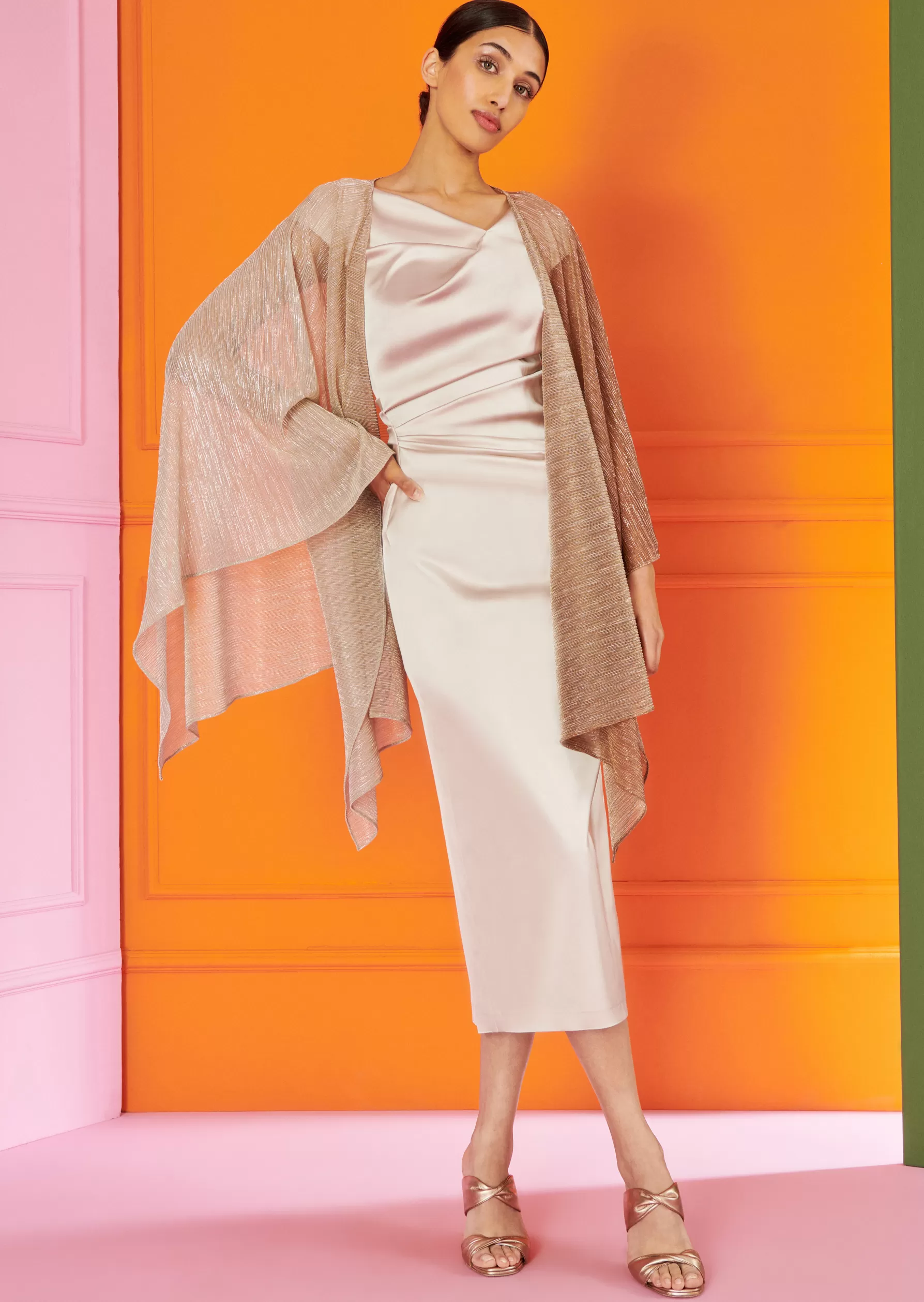 Whether you wear it to a stylish VIP party in Malibu, a summer reception, breakfast at Tiffany’s or even as a discreet outfit to the most important day of your life? Roya1 is a classic for every elegant occasion in life while boasting a fashionable midi length. Made from our bestselling, comfortable stretch satin duchesse material, the pleats of this cream-colored wonder material cling flatteringly to your figure. Combine it with delicate pumps or graceful sandals and wear jewelry to suit the occasion.