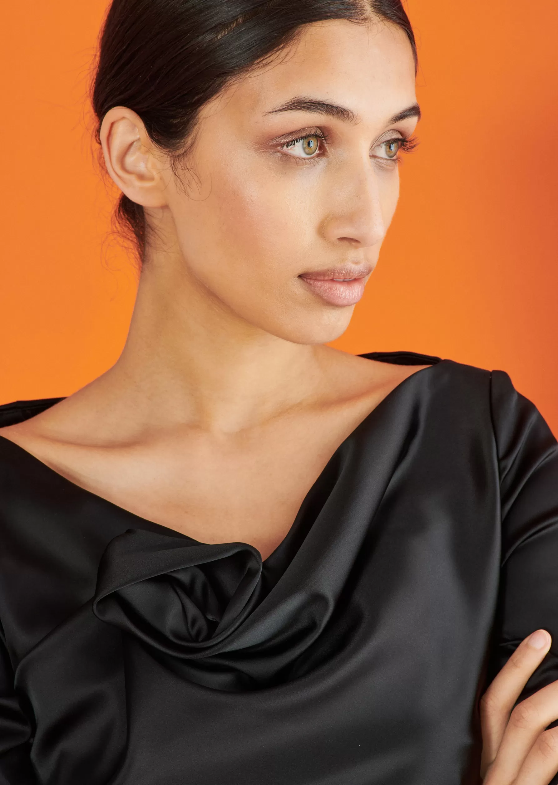 This little black dress exudes all the glamor of the stylish fifties, whisking you off to Madison Avenue in the New York of “mad men”. It draws its subtle sex appeal from its razor-sharp cut that fits your figure perfectly. Even little problem areas disappear under the richly-glossy satin duchesse material with refined drapes. The neckline is low-key and cultivated, boasting a playful rose detail. Slip into gosling1 for official receptions and elegant cocktail events with discreet heels or strappy high-heeled sandals together with discreet jewelry.