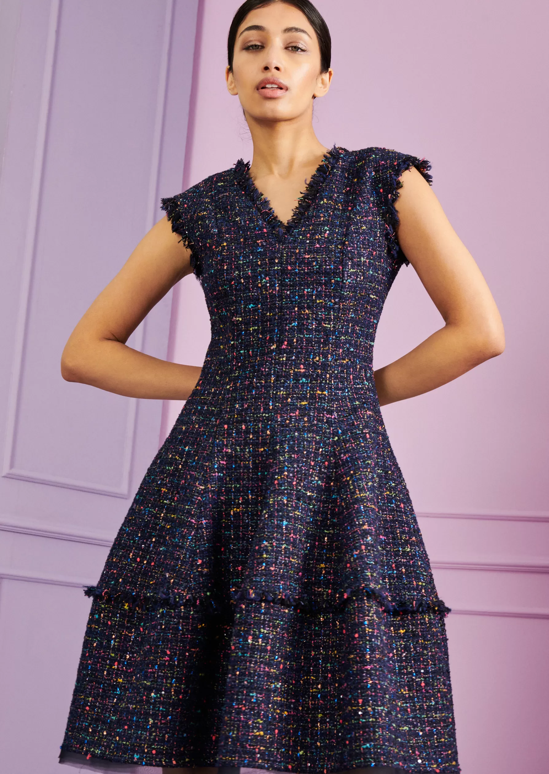this day dress made of a elegant tweed is classic with modern, casual elegance. the fit and flare cut with its defined waist and swinging skirt make this dress the perfect look to accompany you through your day. the discrete v-neck emphasizes your décolleté while fringe details lend this short dress a playful, flirty touch. be sure to try it with one of our leather jackets. with black patent leather heels and a clutch, this look works just as well at the theater or at a fetchin’ party in paris or london.