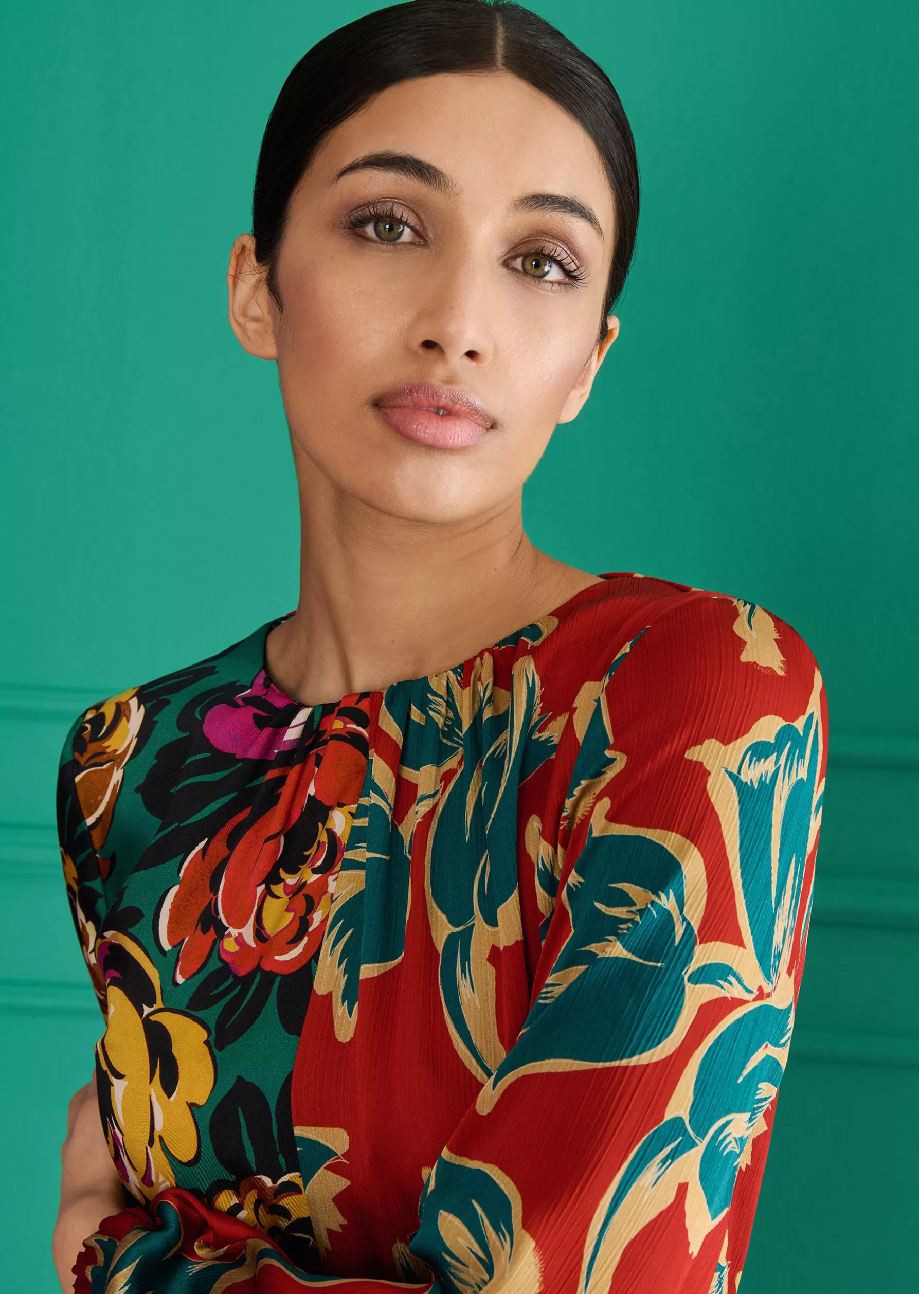 Made from two beautiful floral fabrics that meet at the center seam, this floral, loose-fitting dress is twice as laid-back as any you’ve ever seen. The fabric is subtly pleated at the round neckline. The blousy long sleeves are especially comfortable during the day. Another pleat at the back creates an exciting design detail. In this knee-length day dress, you are sure to feel more at ease in the office and in your everyday life. Plus it’s the perfect choice for your next family celebration. Who knows, you might not even need to bring flowers…