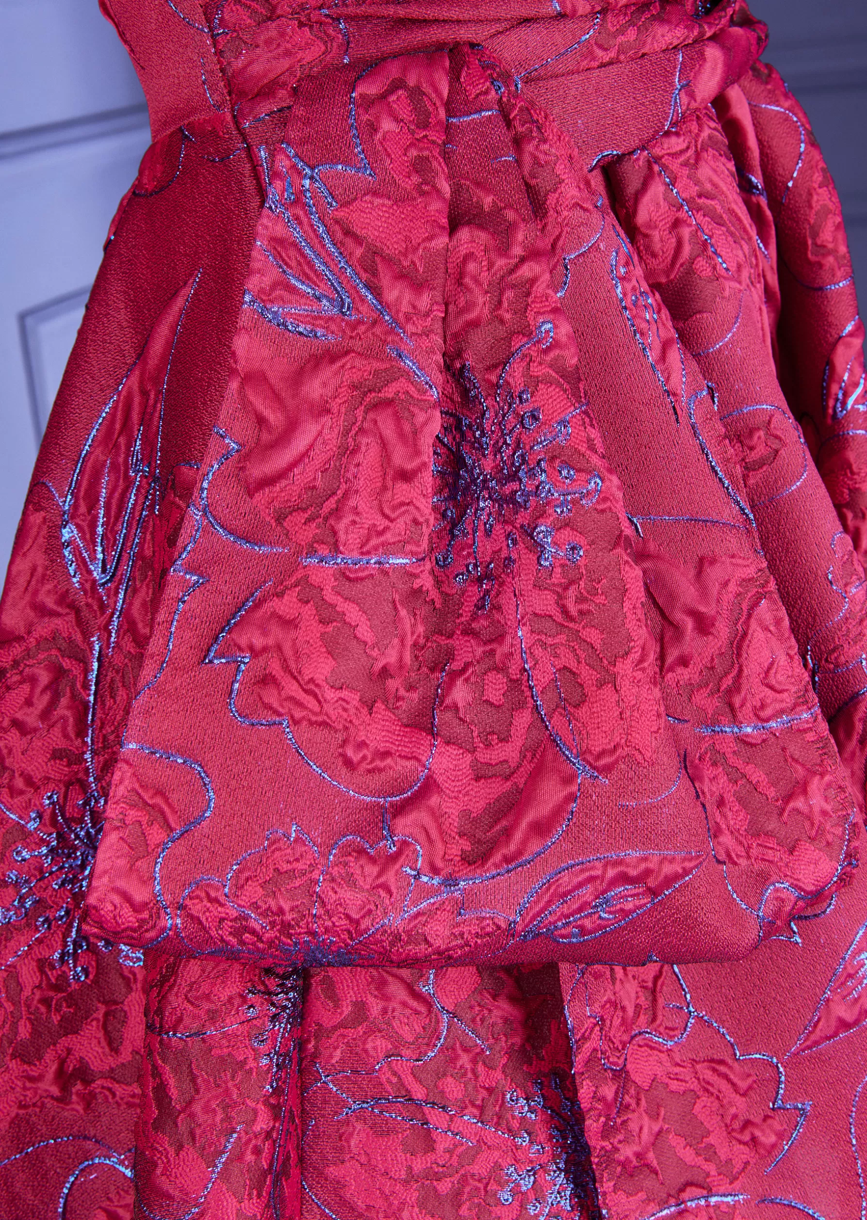 This cocktaildress will work wonders at every celebration, whether it’s your prom, that big wedding reception in the countryside or an elegant dinner. The halterneck cut looks youthful and fresh, yet always elegant. The décolleté is accentuated by a beautiful V-neckline, without revealing too much. Asymmetric draping at the waist creates a slimming effect. And the wide skirt is just made for dancing. Thanks to its practical length, there’s no danger of tripping either. We crafted this cocktail dress from floral jacquard with a subtle sheen, in gorgeous colors that will flatter your complexion. Even if you don’t have a big party coming up, put on this dress and celebrate te night!