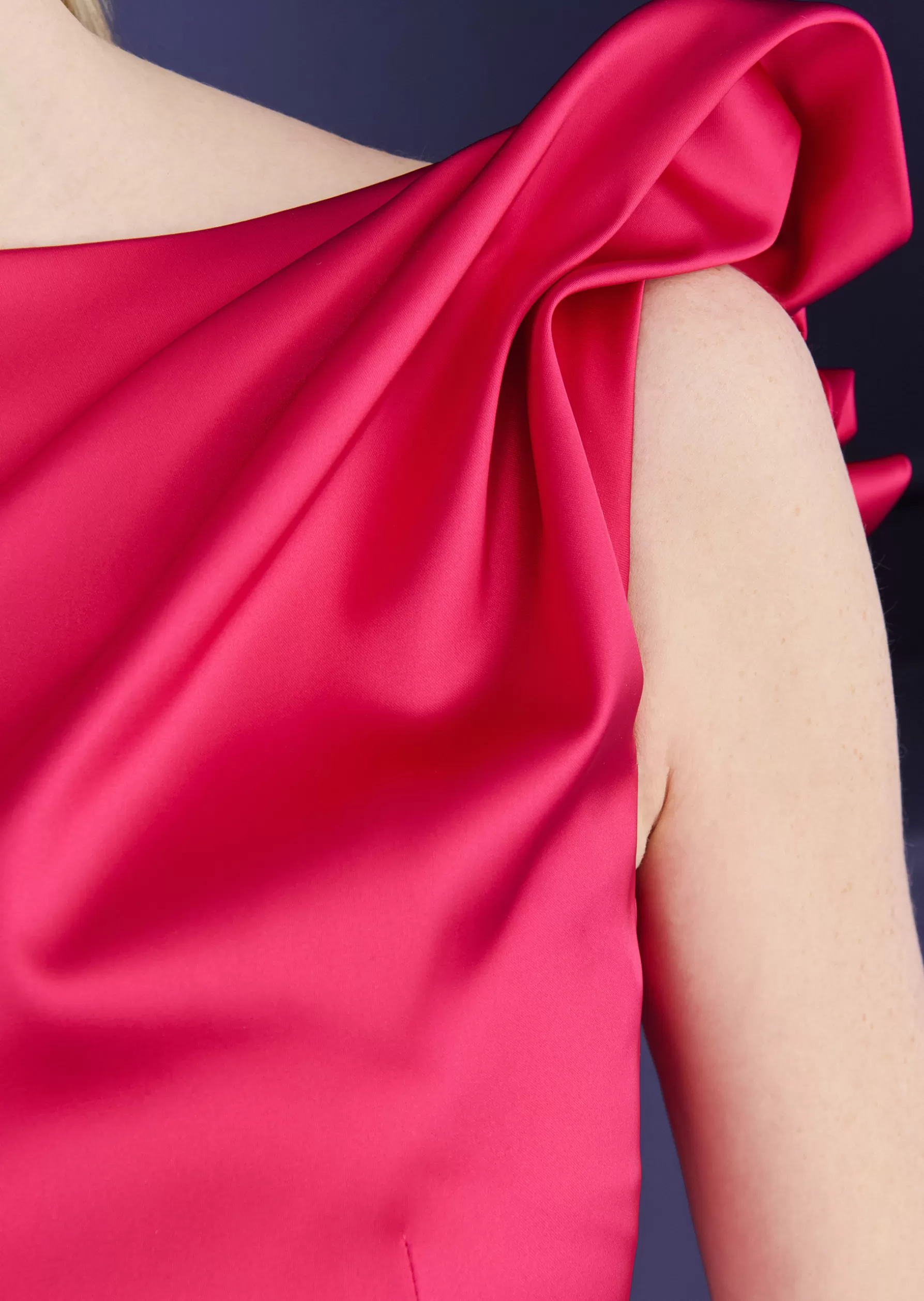 Our floor-length evening dress in elegant, shimmering, stretch duchesse satin promises sophisticated glamor. The fit is narrow, body-defining, and hugs your curves closely. Draped folds make the waist appear slimmer still. The top transitions into another drape which lies in a beautiful ruffle over one shoulder. Whether you wear it as a mother-of-the-bride gown or as an elegant look for the next gala, opera festival or ball – styled with simple sandals, an outfit like this ensures an amazing evening.