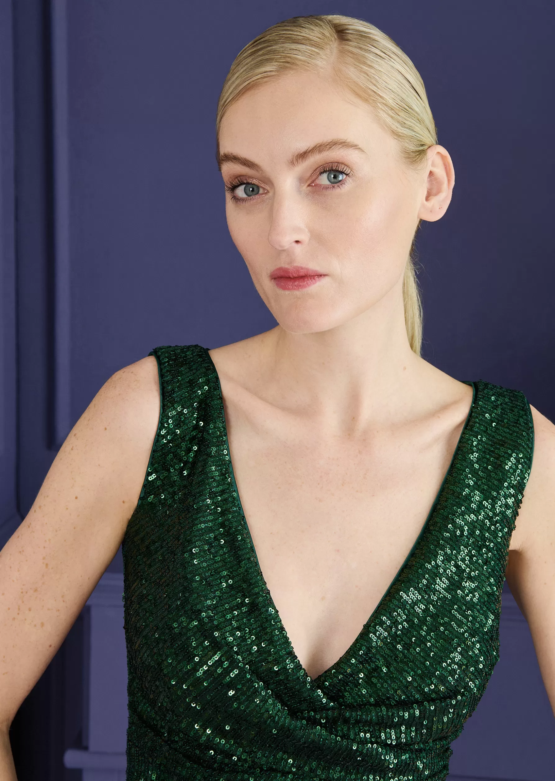 you’ll rival any movie diva in this evening gown: the sequin fabric hugs your figure as if you had been poured into it and shows it off to super effect. subtle draping on the bust and waist flatters your figure, while the skirt is slightly flared towards the hem. whether you’re in the spotlight or in candlelight, on the red carpet, or at a private wedding – countless sequins sparkle on this dress with every move you make. you’re guaranteed to win every fashion oscar in this dress.