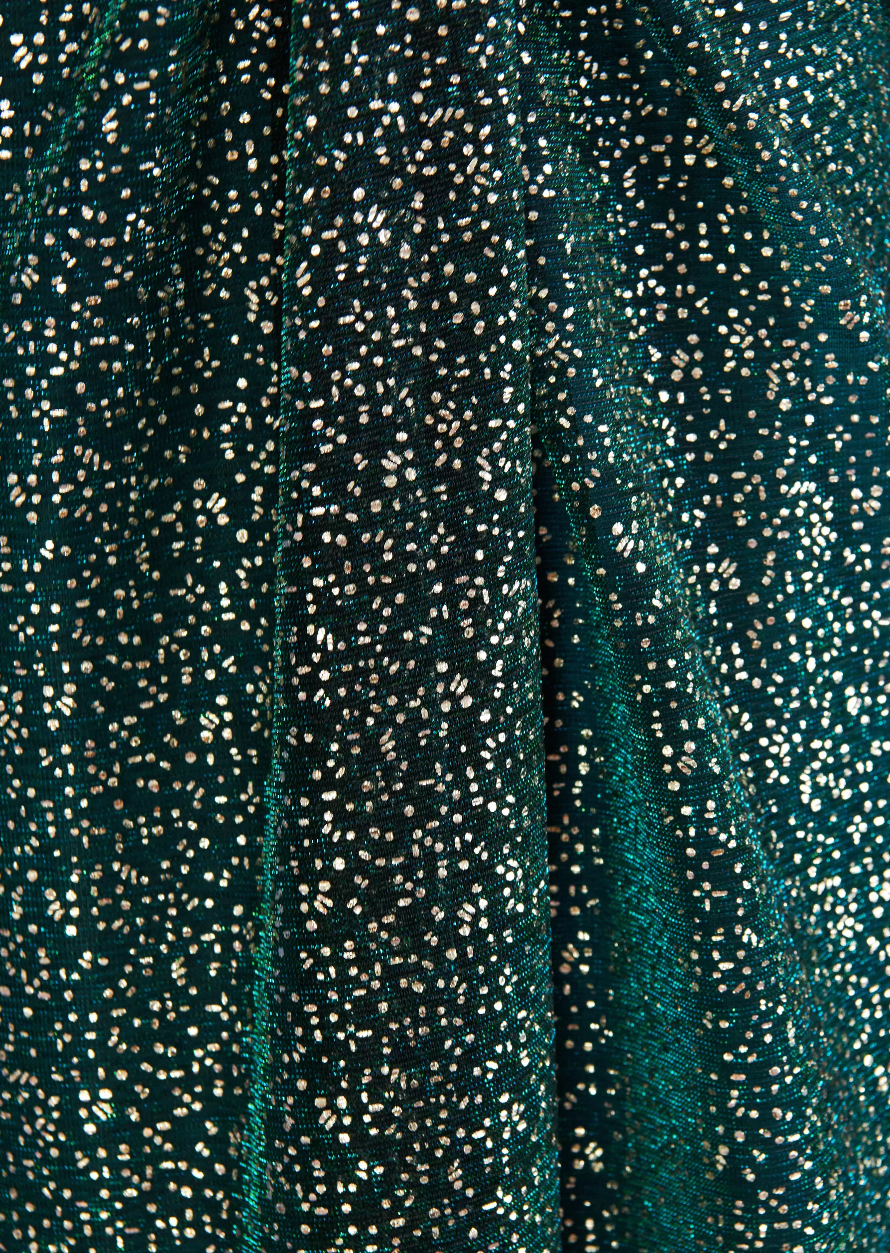 In this floor-length evening gown, you will seamlessly pass as a Hollywood film star. Our designers have created a real boho look: This evening dress doesn’t rely on a figure-enhancing silhouette, instead conjuring a light, playful feel as an A-line cut, like a caftan. The material, a glittering metallic voile, features a knotted effect on this number. In the back, a flowing cape adds some drama. With this look, you’ll become the sophisticated hostess at your next party. Then there’s only one last thing to remember: the grand entrance on your own show stairs!